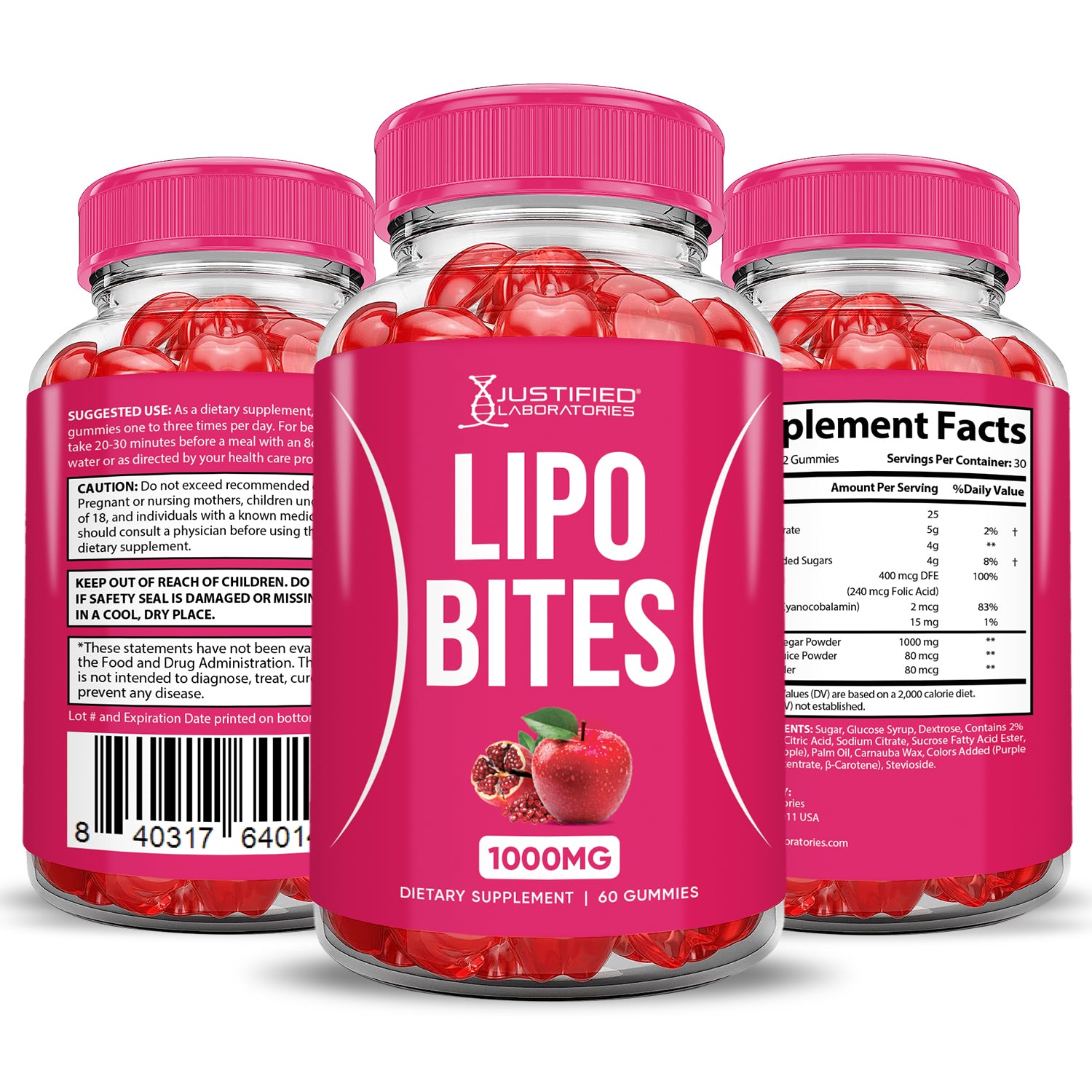 Lipo Bites are designed to elevate your wellness routine with a powerful blend of apple cider vinegar, pomegranate juice, beet root, B12, and folate—all in a delicious, easy-to-enjoy gummy. Packed with 1000MG of ACV per serving, these gummies help support your overall well-being without the harsh vinegar taste.