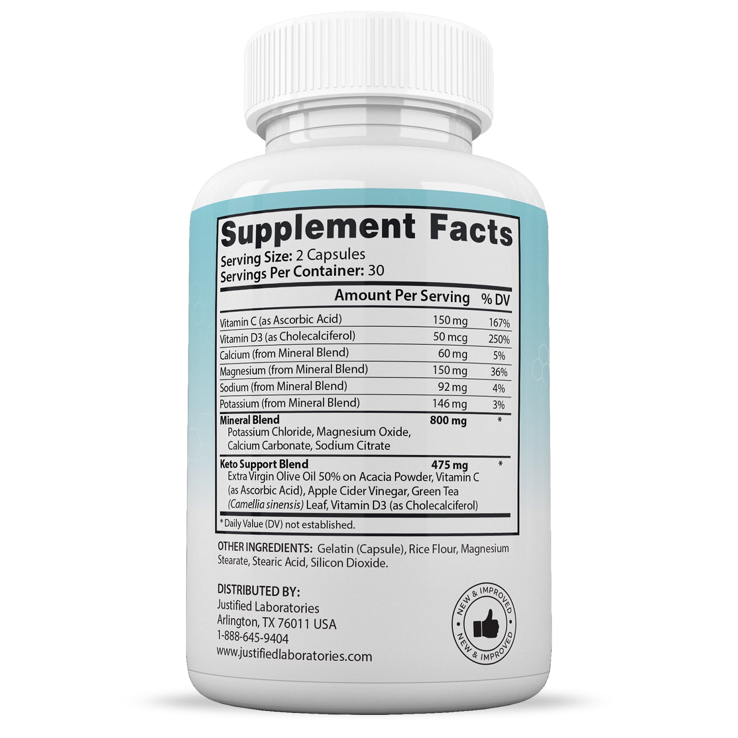 Ingredienti: Miscela brevettata di supporto Keto che include aceto di mele, olio extravergine di oliva in polvere e foglie di tè verde, vitamina C, vitamina D3, magnesio, calcio, sodio, potassio